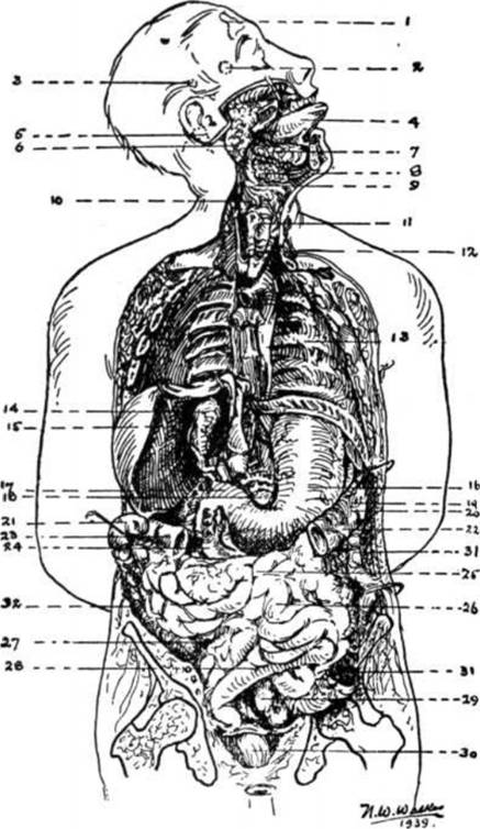 It is my opinion that the most important subject missing in elementary schools, is ANATOMY. This sketch is included here to serve as a guide and handy reference. The numbers indicate the location of the various parts.
