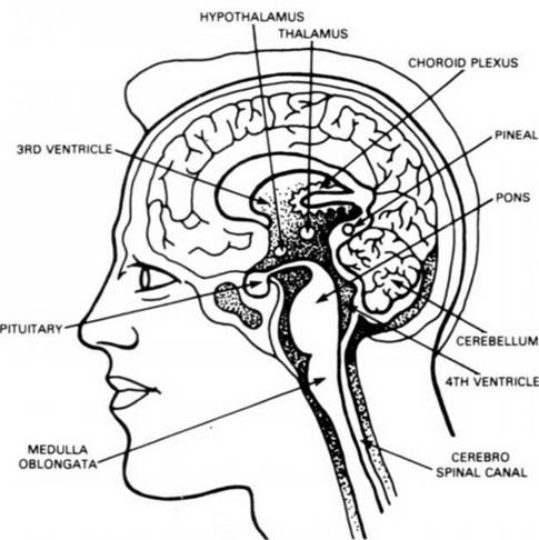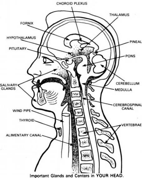 5.         The Medulla Oblongata, the central Nerve-telephone-exchange, is situated in the lower middle part of the head between the upper lip and the base of the skull, just above the Atlas or first cervical vertebra.